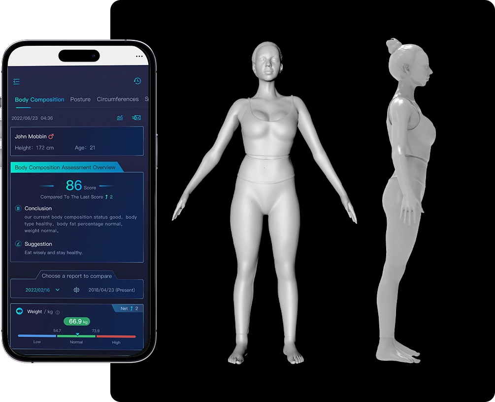 Gera um modelo tridimensional do corpo para acompanhar alterações de forma visual ao longo do tempo.